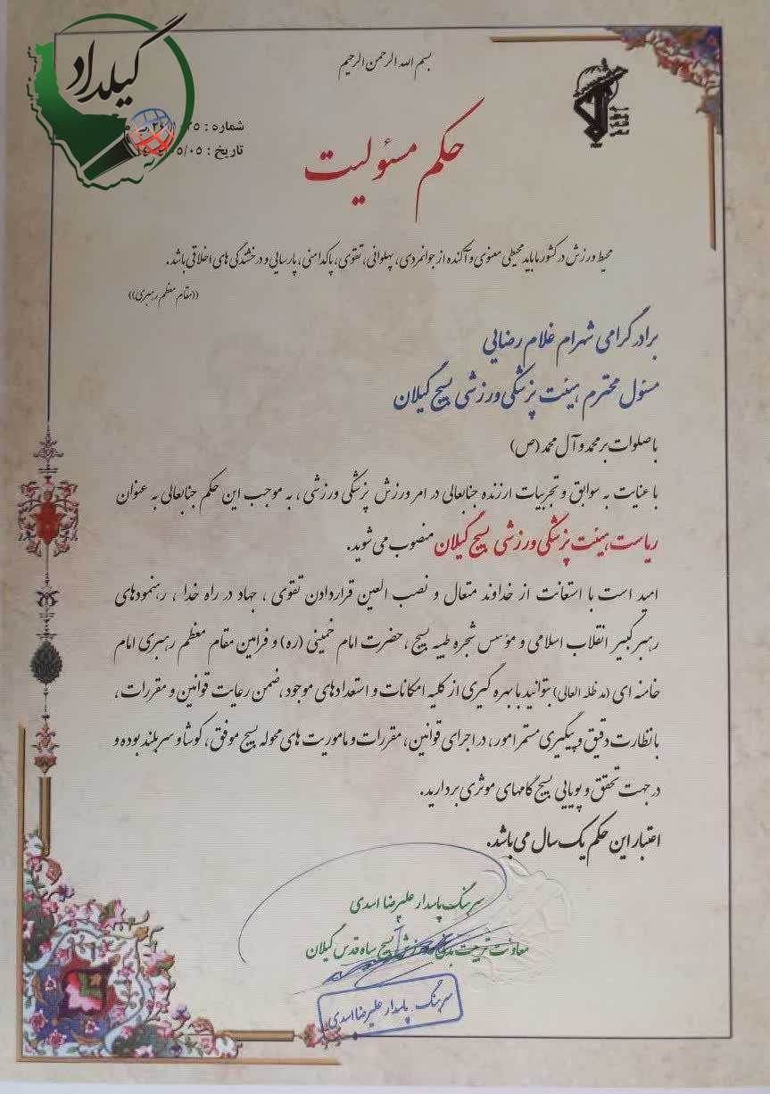 با حکم معاونت تربیتبدنی و ورزش سپاه قدس گیلان: